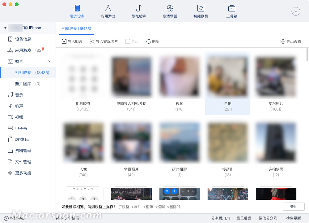 除了上面两种方法,你还可以在 Mac 上安装第三方软件,比如爱思助手,它的特点是可以按照片视频类型显示各类相簿,而且这款软件除了可以导照片视频之外,还有 iPhone 备份、制作铃声等其他各种 iPhone 管理功能。