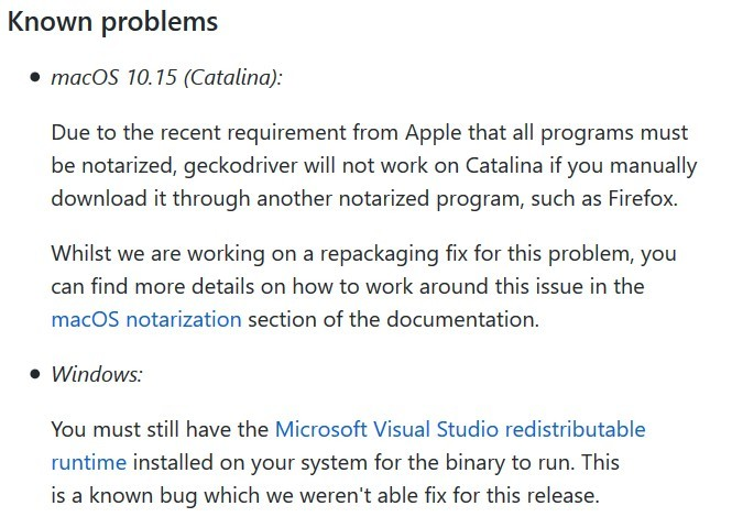 通过GitHub下载GeckoGriver,网址https://github.com/mozilla/geckodriver/releases,目前最新版本为0.26,下载即可, 注意存在的已知问题,如下: