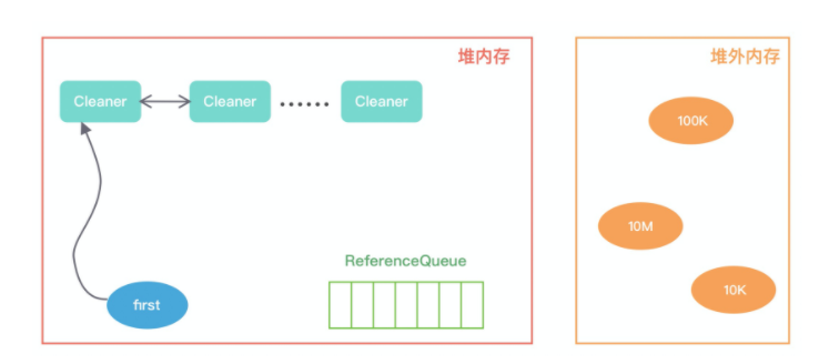 当初始化堆外内存时,内存中的对象引用情况如下图所示,first 是 Cleaner 类中的静态变量,Cleaner 对象在初始化时会加入 Cleaner 链表中。DirectByteBuffer 对象包含堆外内存的地址、大小以及 Cleaner 对象的引用,ReferenceQueue 用于保存需要回收的 Cleaner 对象