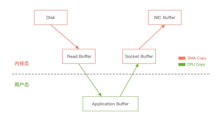 当用户进程发起 read() 调用后,上下文从用户态切换至内核态。DMA 引擎从文件中读取数据,并存储到内核态缓冲区,这里是第一次数据拷贝。