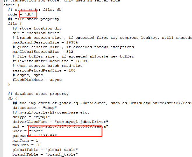 修改 D:\seata-server-1.1.0\seata\conf 目录下file.conf文件,数据库信息,如图两处