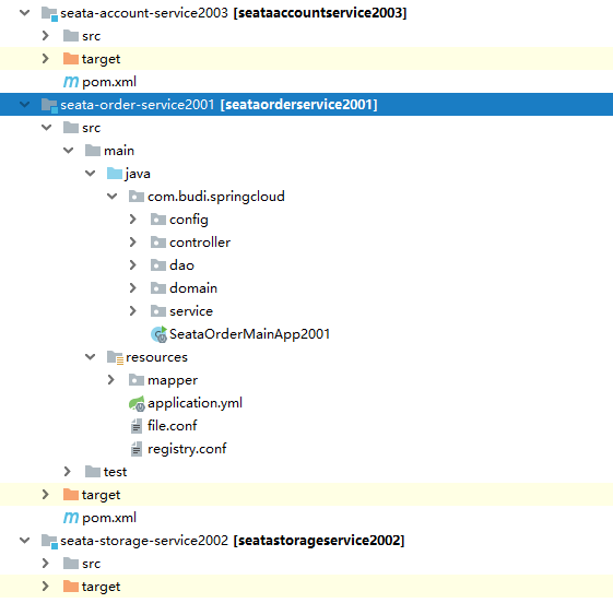 由于下订单还需要操作库存库和账户库,要调用库存微服务和账户微服务,所以需要创建对应的StorageService和AccountService,微服务调用使用openFeign,微服务名和调用方法要都保持一致