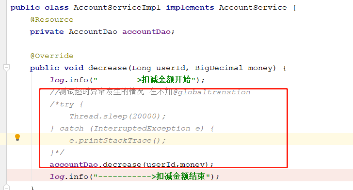 非正常:我们人为的在账户业务处理类设置超时,看是否出现回滚(订单服务实现类别忘加注解