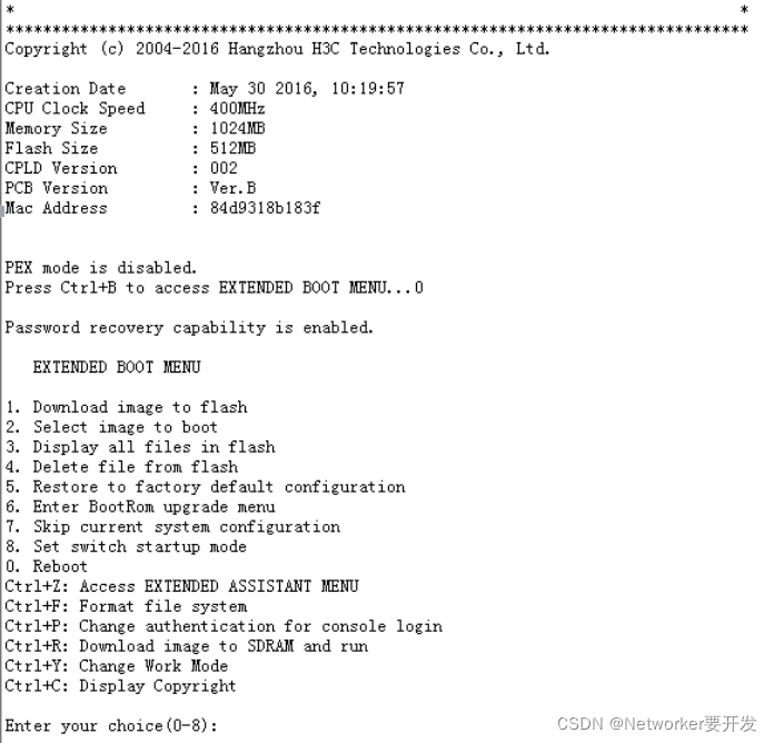 #断电重启交换机,当出现Press Ctrl-B to enter Extended Boot menu...3时,迅速按Ctrl+B(也可以开机启动的时候一直按着ctrl+B),进入bootware菜单后,提示输入密码。密码默认为空,直接回车即可,然后显示如下界面: