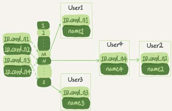 User2和User4根据身份证号算出来的值都是N,但没关系,后面还跟了一个链表。假设,这时候你要查ID_card_n2对应的名字是什么,处理步骤就是:首先,将ID_card_n2通过哈希函数算出N;然后,按顺序遍历,找到User2。