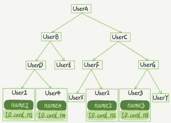 二叉搜索树的特点是:每个节点的左儿子小于父节点,父节点又小于右儿子。这样如果你要查ID_card_n2的话,按照图中的搜索顺序就是按照UserA -> UserC -> UserF -> User2这个路径得到。这个时间复杂度是O(log(N))。