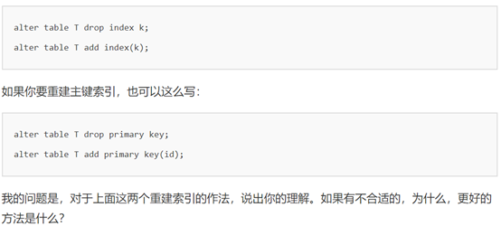 InnoDB表T,如果你要重建索引k,你的两个SQL语句可以这么写: