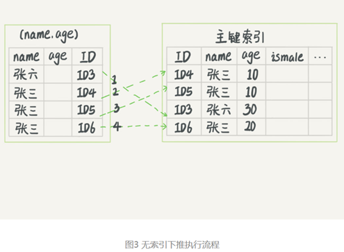 在MySQL 5.6之前,只能从ID3开始一个个回表。到主键索引上找出数据行,再对比字段值。