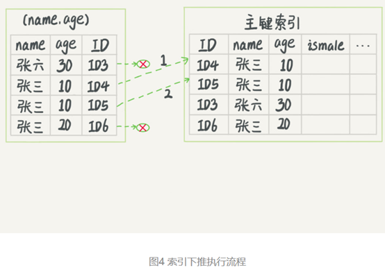 图4跟图3的区别是,InnoDB在(name,age)索引内部就判断了age是否等于10,对于不等于10的记录,直接判断并跳过。在我们的这个例子中,只需要对ID4、ID5这两条记录回表取数据判断,就只需要回表2次。