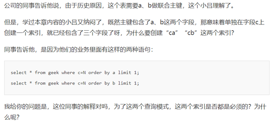 那么,如果既有联合查询,又有基于a、b各自的查询呢?查询条件里面只有b的语句,是无法使用(a,b)这个联合索引的,这时候你不得不维护另外一个索引,也就是说你需要同时维护(a,b)、(b)这两个索引。