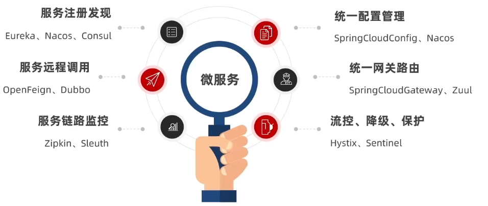 | 注册中心 | zookeeper、Redis | Eureka、Consul | Nacos、Eureka |