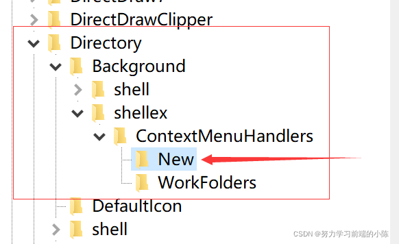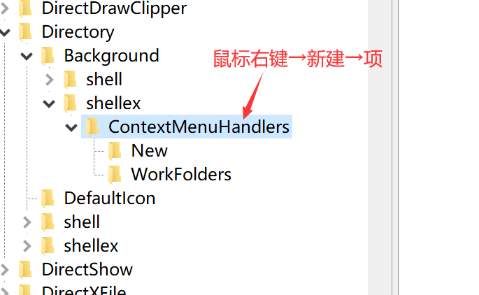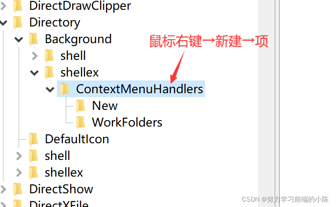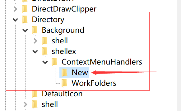 第三步:依次展开“HKEY_CLASSES_ROOT\Directory\Background\shellex\ContextMenuHandlers\New”;如果没有就该文件夹就“右键”--> “新建” --> 输入你要添加的文件名(这里输入New,输入其他文件名可能会失效)