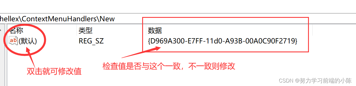 第四步:确认右边的“默认”项后边的“值”为{D969A300-E7FF-11d0-A93B-00A0C90F2719}。如果不是,就修改为此值,点击确定;