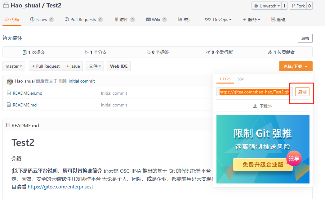 cd Test2(3)将文件复制到克隆下来的项目文件夹中README.md文件是下载下来的