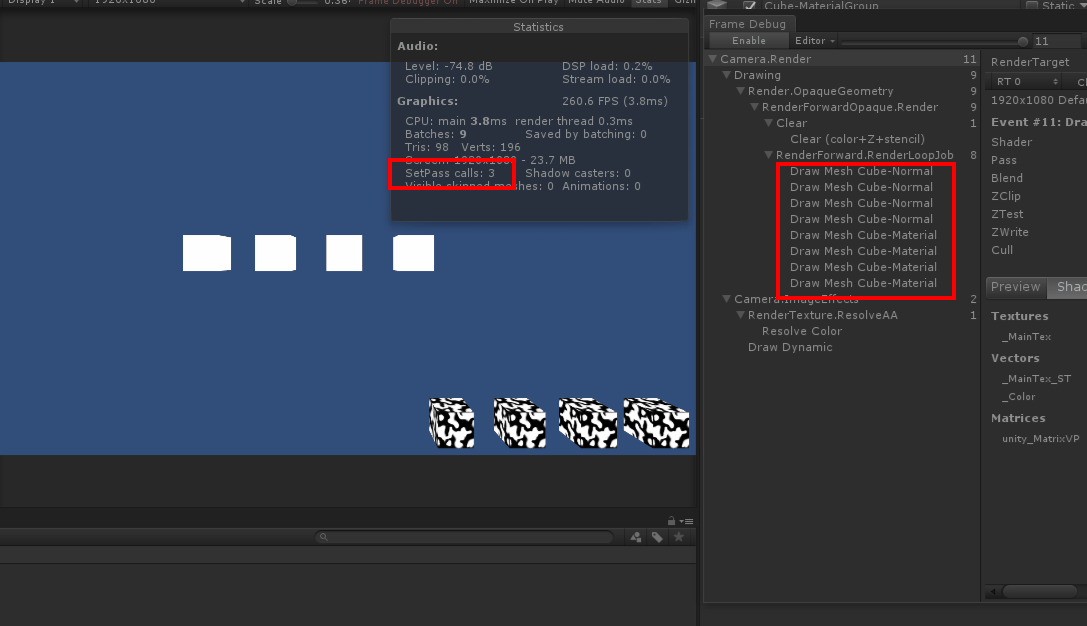 看右边的FrameDebugger,当我移动黑白组时,渲染顺序发生了穿插,也就是说本来的渲染顺序是11112222,一但渲染顺序变成21111222时,由于渲染的material多切换了一次,所以SetPassCall也加了一次。回到正题,通过这个例子可以很直观的理解,当切换渲染material时(第一次渲染也是切换渲染)会发生一次SetPassCall,如果两组物体用12121212的渲染方式很显然会更加的浪费性能,这样会发生8次SetPassCall