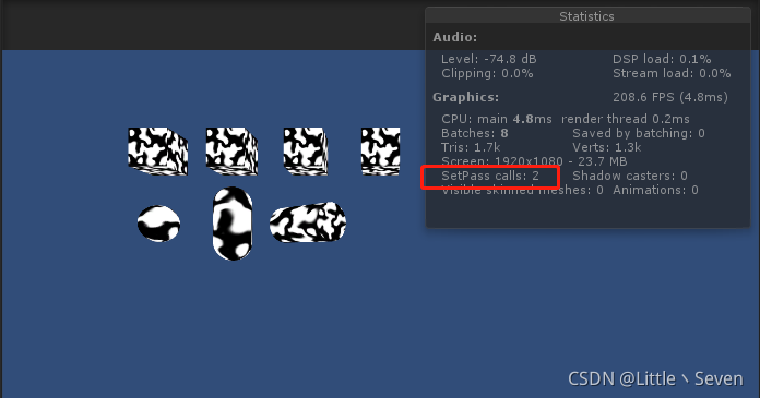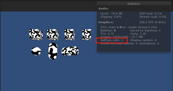 场景中有4种网格的物体,分别是4个相同的Cube,1个Sphere,1个Cylinder,1个Capsule,7个物体都使用了同一个材质球。当前SetPassCall总数量是2,其中摄像机SetPassCall发生1次,其他的7个物体发生了1次,也就是说,按顺序渲染物体时,只要Material没发生变化,那么SetPassCall就不会发生。