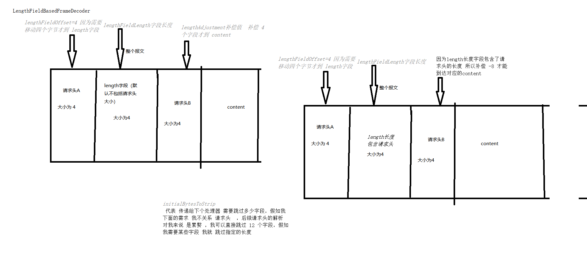 * lengthFieldOffset: 请求头偏移数量 因为 有可能你的length字段并不是第一个字段 有可能第二个字段才是代表了 长度字段