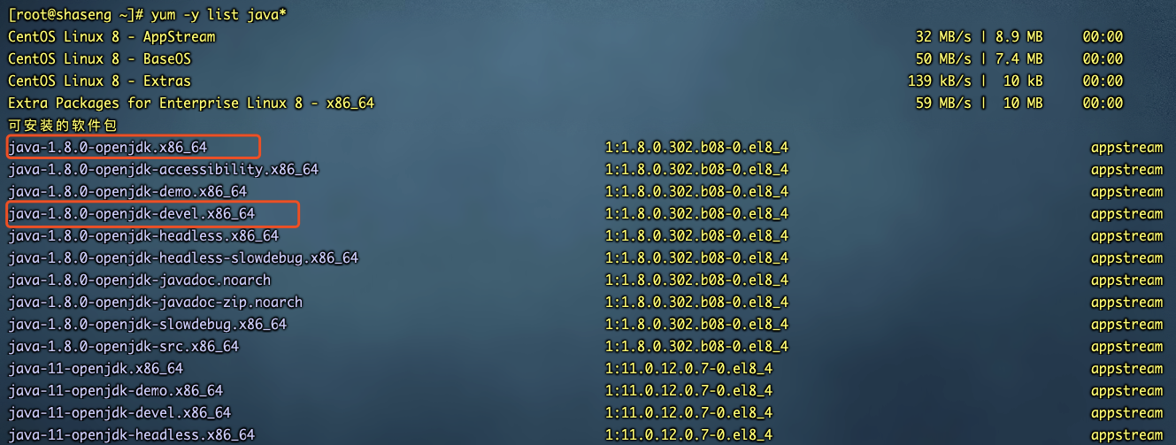 执行命令yum -y list java*查看可安装java版本。执行成功后可以看见如下的结果