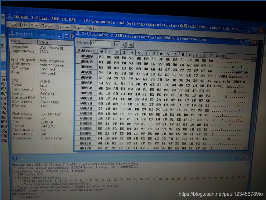 然后,继续File——open 打开步骤“5)”生成的bootrom.bin,文件;然后“Target——Program”烧写到NOR Flash中,断点,拔掉JLink。