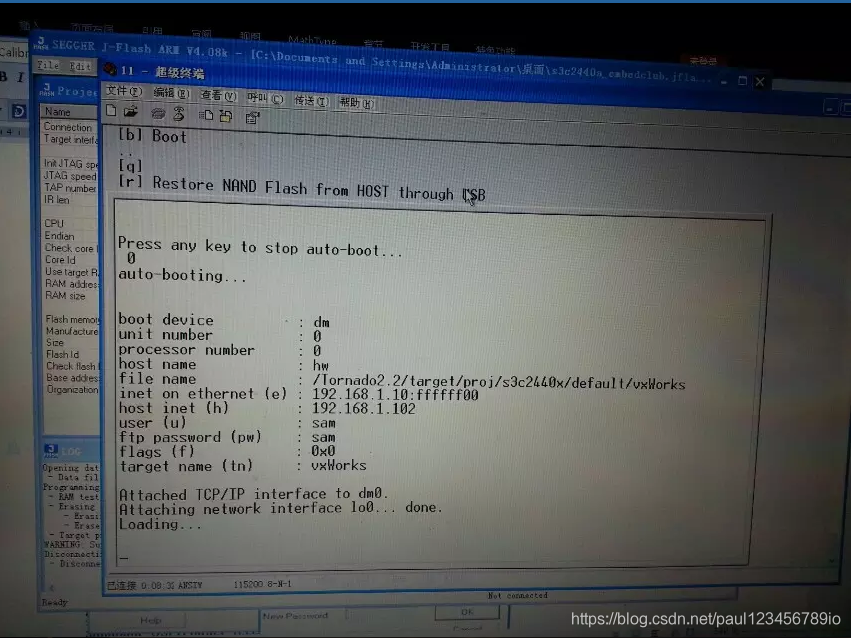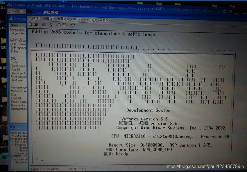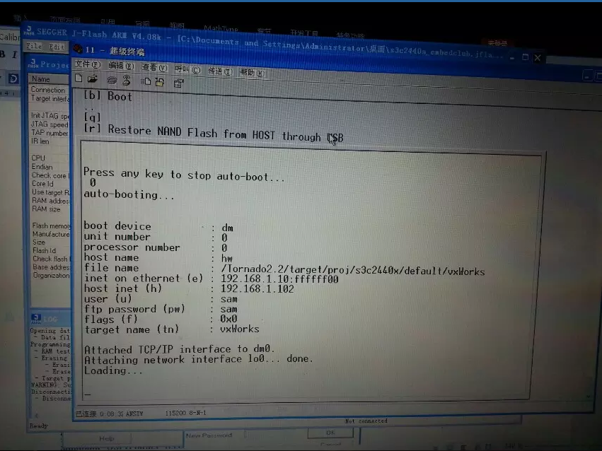 冒着雨,骑着电动车,去广埠屯买jlink的转接板,顺便买了一对垃圾组装台式机。然后,是用jlink烧写norflash,写s3c2440的原版地址(相当于格式化硬盘fat、NTFS等);接着把上次编写好VxWorks的bsp(初始化mini2440上的网卡等接口),这样子,就可以把网线对接,(看见实验班和笔记本的灯亮起来,我就知道bsp启动了!);最后用传统的fpt下载裁剪好的VxWorks镜像文件。看见VxWorks的logo,我终于完成了三年前的设想,在ARM板上跑硬实时的vxworks的操作系统。哈哈!哥就是流弊啊!