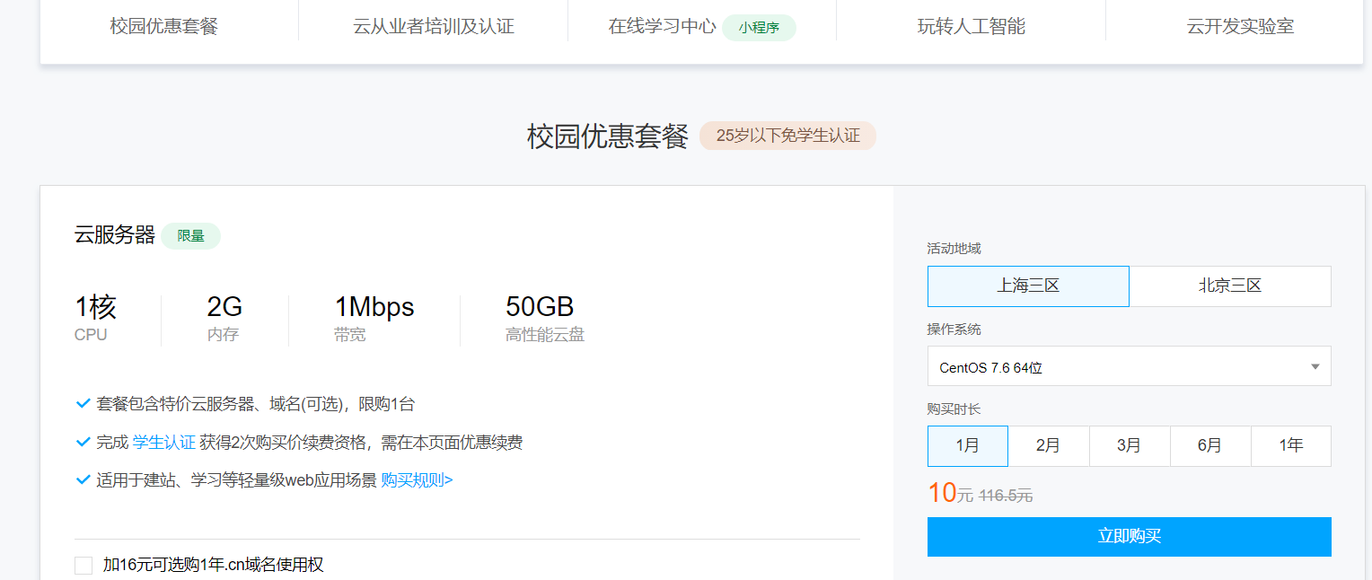 腾讯云阿里云等各大互联网巨头的产品对学生都有很大的优惠,这里我选择了腾讯云的centos7.6 64位的套餐,完成认证后十块钱就可以获得该配置服务服务器的一个月使用权。
