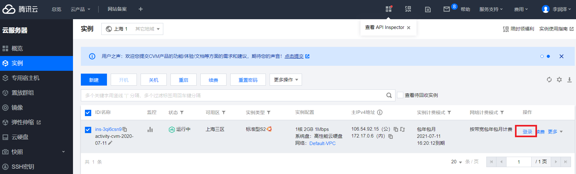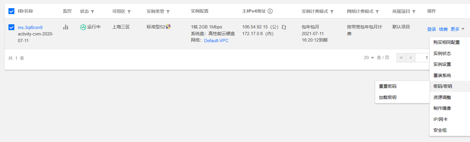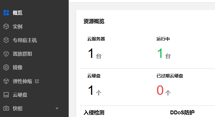 点击左侧功能栏中的实例,可以看到我们所租用的云服务器的详细信息