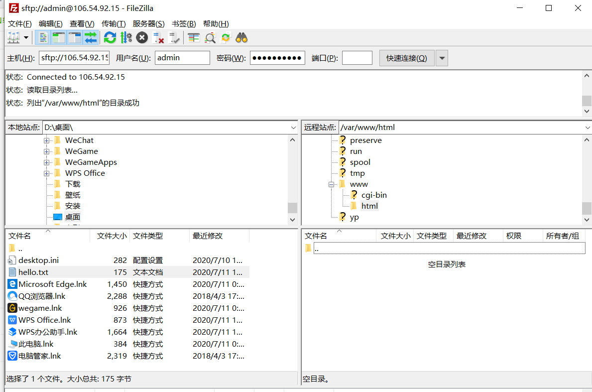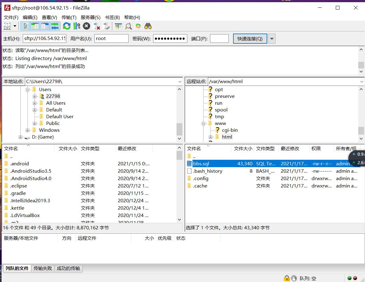 2)将所导出的sql文件通过filezilla上传至云服务器中,这里我放在了/var/www/html文件夹下,后面导入使用该路径