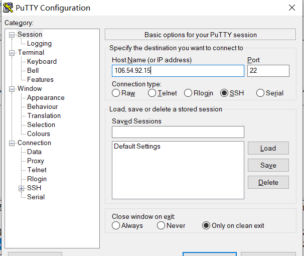1)打开putty输入我们所购买的云服务器的外网ip以及端口号