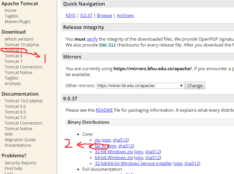 点击左侧Tomcat9,再找到下图位置点击tar.gz链接下载到本地