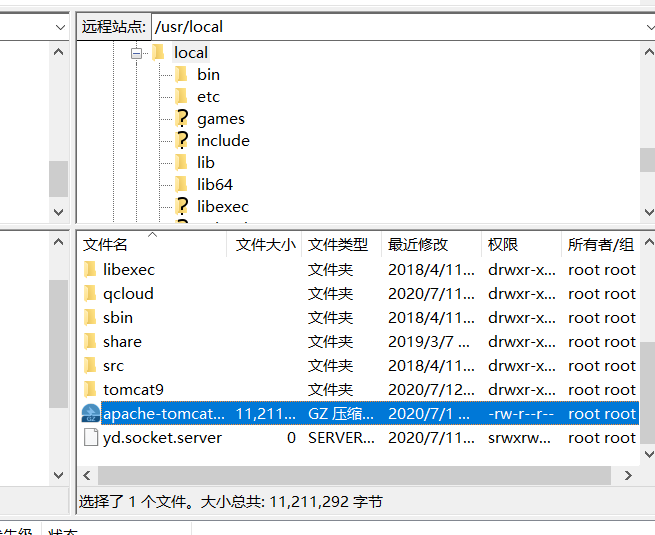 打开Filezilla使用root用户及密码通过22端口登录我们的IP,并将所下载的Tomcat 包拖入云服务器的 \usr\local 文件夹中