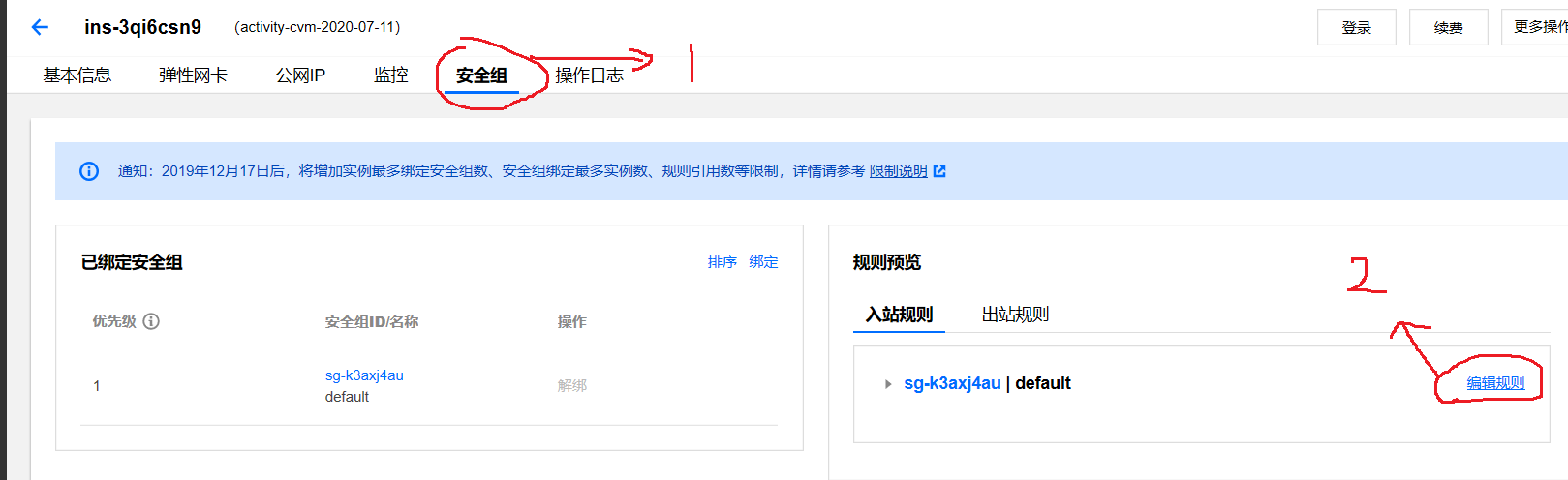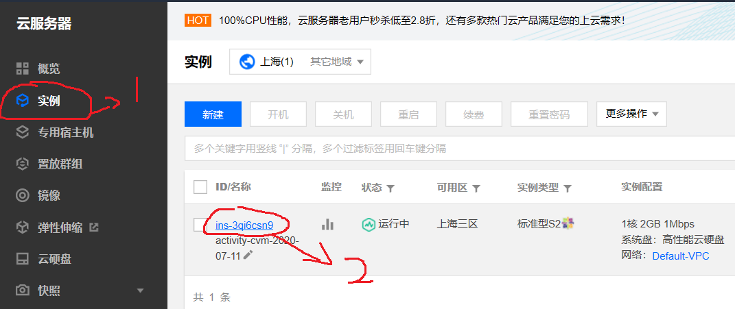 进入我们租用的云服务器的控制台,点击左侧实例,点击服务器名称,进入服务器页面