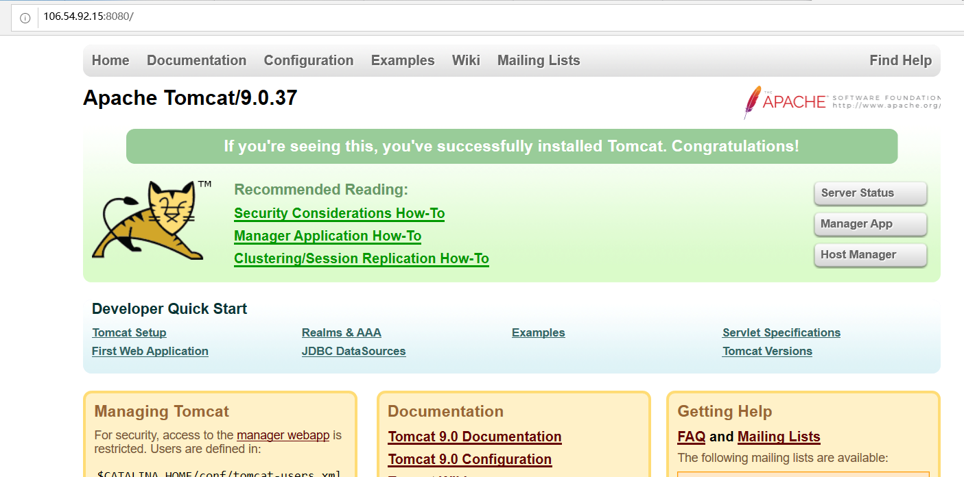 点击完成,即可通过浏览器输入 http://+ip地址+:8080 实现web访问,如下图,显示Tomcat内置实例页即为配置成功!