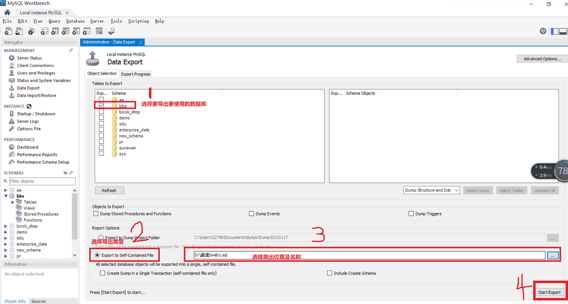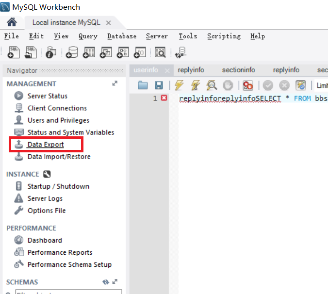 1)首先使用mysql workbench 将本地web项目所使用的数据库导出为sql文件