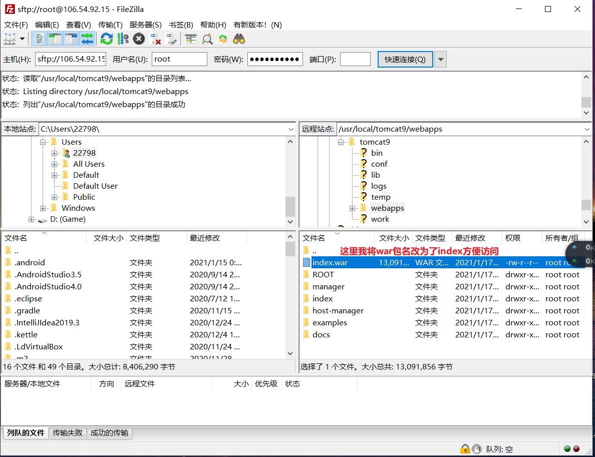 3)将生成的war文件上传至云服务器tomcat文件夹下的webapps目录中