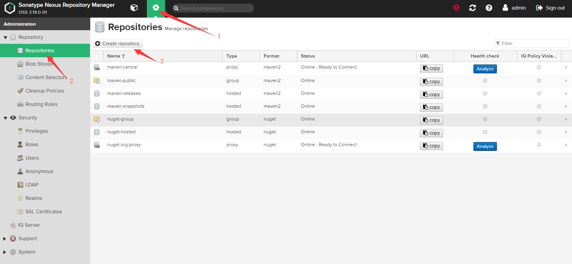- 登录nexus,点击'设置'-->'Repositories'-->'Create repository'