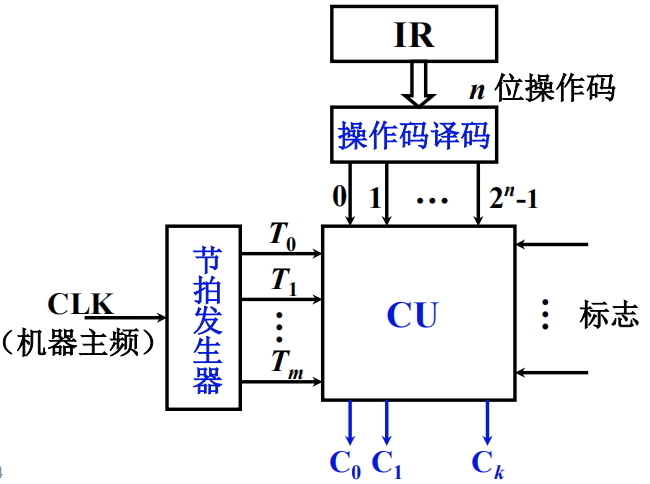 控制单元的时钟输入实际上是一个脉冲序列,其频率即为机器的主频,它使CU能按一定的节拍发出各种控制信号。