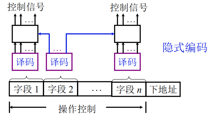 这种方式一个字段的某些微命令还需由另一个字段中的某些微命令来解释,由于不是靠字段直接译码发出微命令,故称为字段间接编码,又称为隐式编码。