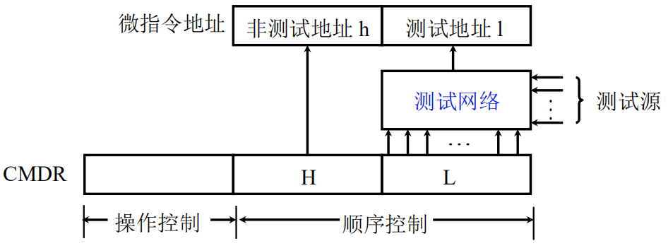 微指令的地址还可以通过测试网络形成。图中微指令的地址分两部分,高段h为非测试地址,由微指令的H段地址码直接形成;地段1为测试地址,由微指令的L段地址码通过测试网络形成。