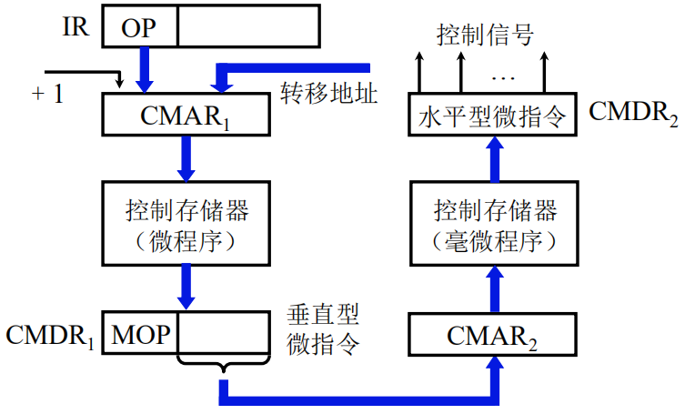 CMAR1为第一级控存地址寄存器,C M D R 1 存放从第一级控制存储器中读出的微指令,如果该微指令只产生一些简单的控制信号,则可以通过译码,直接形成微操作命令,不必调用第二级。