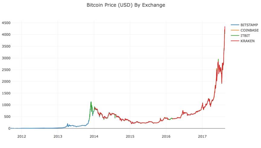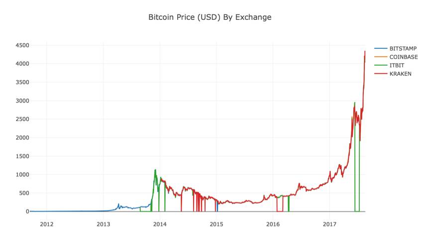你可能已经注意到,上面的数据集中存在数据缺失现象--特别是在2014年末和2016年初。在Kraken交易所的数据集中,这种数据缺失情况尤为明显。我们当然不希望这些数据会影响到我们对价格的全面分析。