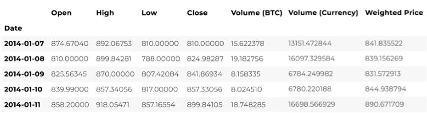 # Pull Kraken BTC price exchange data btc_usd_price_kraken = get_quandl_data('BCHARTS/KRAKENUSD')我们可以用head()方法来查看数据框的前五行。