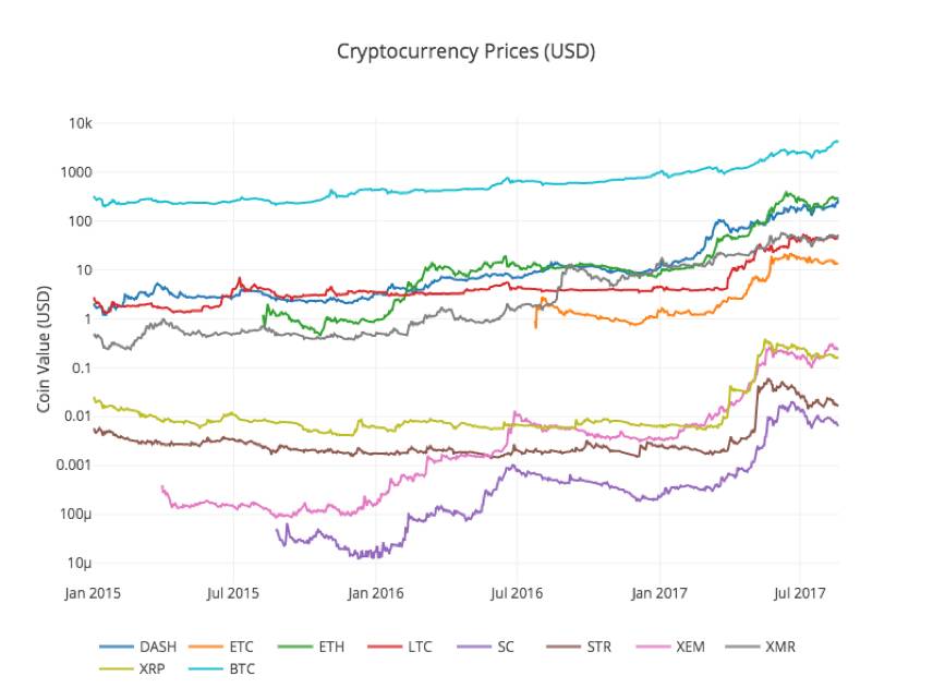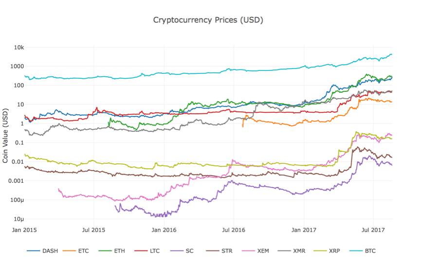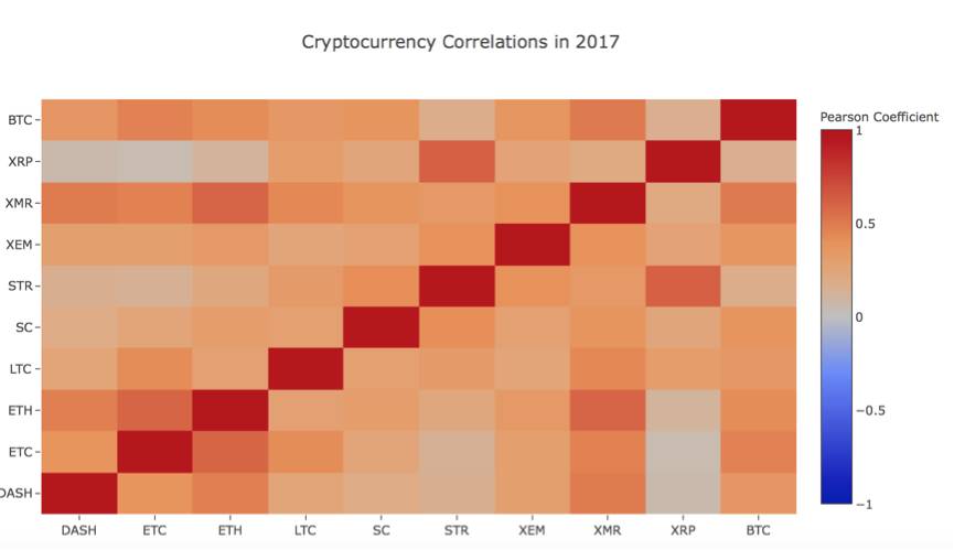 你可能注意到电子货币的汇率看上去似乎是相关的,尽管他们的货币价值相差很大,而且波动性很高。尤其是从2017年4月的迅猛上涨开始,甚至很多的小波动似乎都与整个市场的波动同步出现。