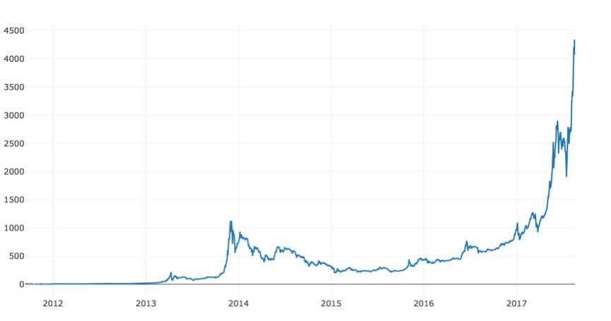 # Plot the average BTC pricebtc_trace=go.Scatter(x=btc_usd_datasets.index, y=btc_usd_datasets['avg_btc_price_usd'])py.iplot([btc_trace])
