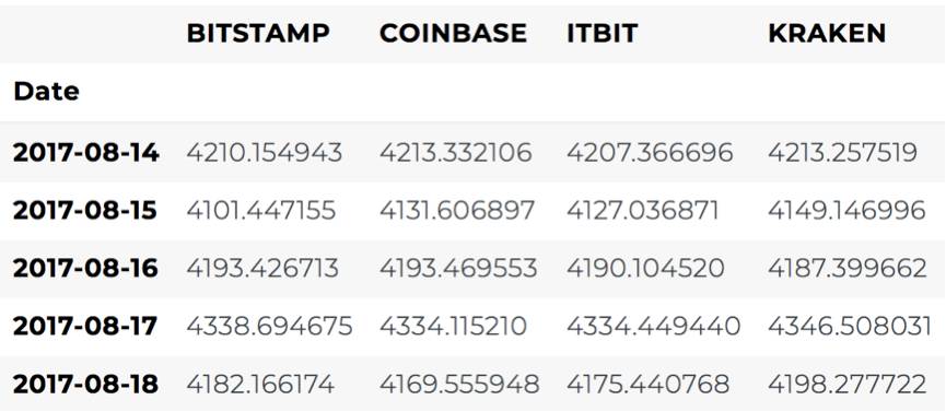 # Merge the BTC price dataseries' into a single dataframebtc_usd_datasets=merge_dfs_on_column(list(exchange_data.values()), list(exchange_data.keys()),'Weighted Price')最后,可以使用“tail()”方法,查看合并后数据的最后五行,以确保数据整合成功。
