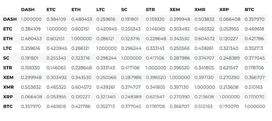 例如,从上图中可以很明显看出XRP(Ripple的代币)是与其他电子货币相关性最低的。但这里有一个值得注意的例外是STR(Stellar的代币,官方名字是"Lumens"),与XRP有强相关关系(相关系数:0.62)。