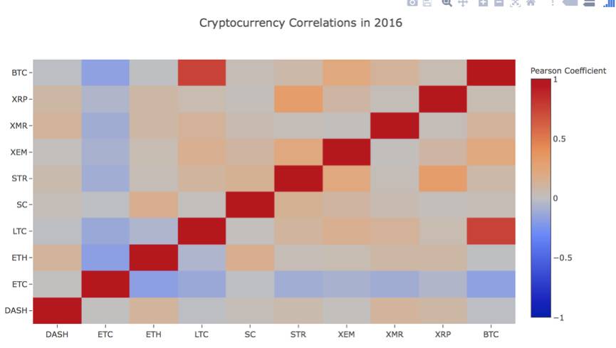 这张图表说明了什么呢?关键在于,它说明了不同的数字加密货币价格在2016年间的波动情况,几乎没有统计上的显著相关性。