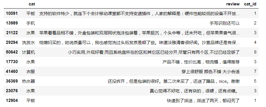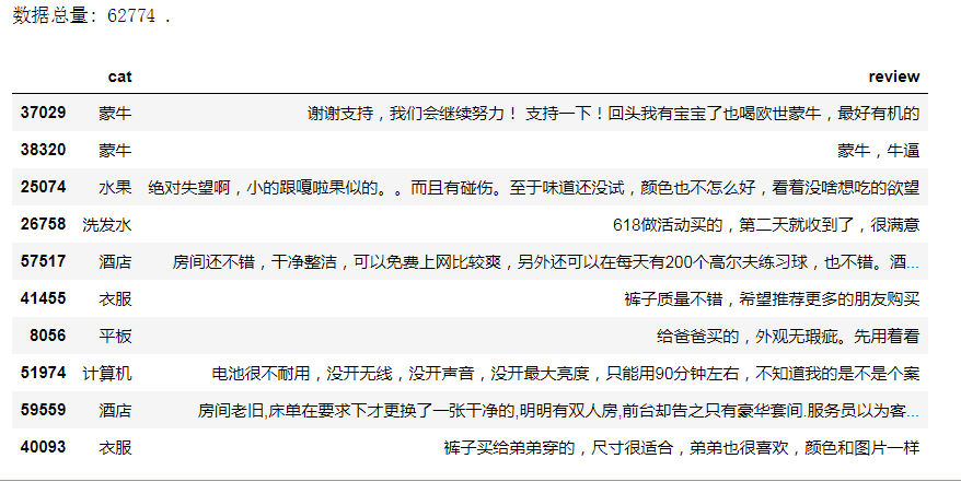 我们的数据来自于互联网,你可以在这里下载,数据中包含了10 个类别(书籍、平板、手机、水果、洗发水、热水器、蒙牛、衣服、计算机、酒店),共 6 万多条评论数据 首先查看一下我们的数据,这些数据都是来自于电商网站的用户评价数据,我们想要把不同评价数据分到不同的分类中去,且每条数据只能对应10个类中的一个类。
