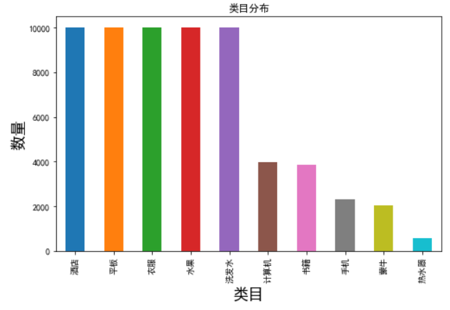 我们看到各个类别的数据量不一致,洗发水、衣服、酒店、水果、平板的数据量最多各有1万条,而热水器的数据量最少只有574条,分布很不均匀,接下来我们用图形化的方式再查看一下各个类别的分布。