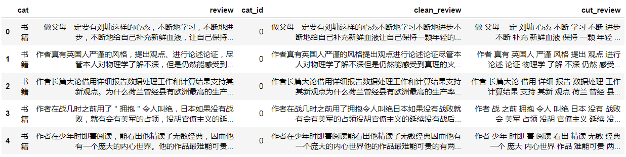 我们过滤掉了review中的标点符号和一些特殊符号,并生成了一个新的字段 clean_review。接下来我们要在clean_review的基础上进行分词,把每个评论内容分成由空格隔开的一个一个单独的词语。
