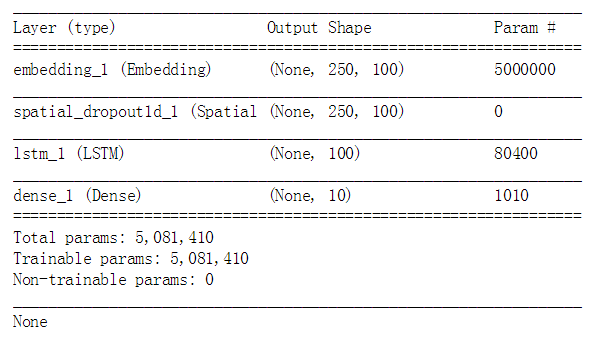 - 模型的第一次是嵌入层(Embedding),它使用长度为100的向量来表示每一个词语
